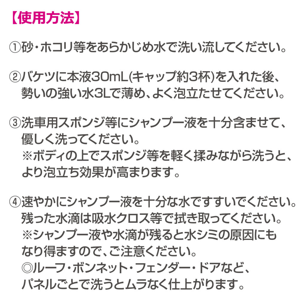 4. 速やかにシャンプー液を十分な水ですすいでください。残った水滴は吸水クロス等で拭き取ってください。 ※シャンプー液や水滴が残ると水シミの原因にもなり得ますので、ご注意ください。 ※ルーフ・ボンネット・フェンダー・ドアなど、パネルごとで洗うとムラなく仕上がります。 |