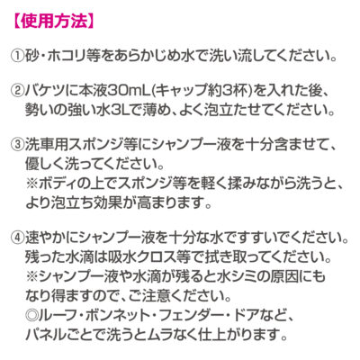 3. 洗車用スポンジ等にシャンプー液を十分含ませて、優しく洗ってください。 ※ボディの上でスポンジ等を軽く揉みながら洗うと、より泡立ち効果が高まります。 | |