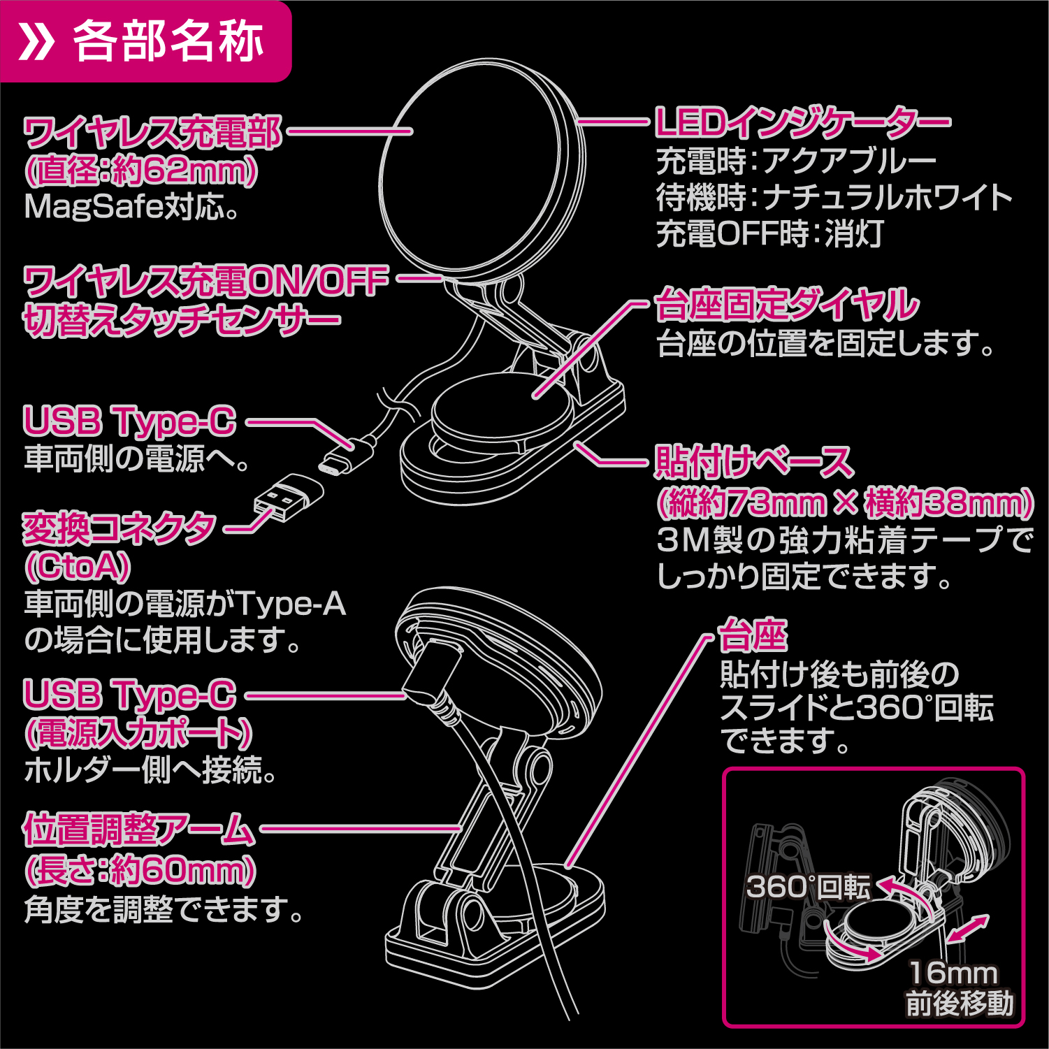 ・ワイヤレス充電ON/OFF切替えタッチセンサー付きです。